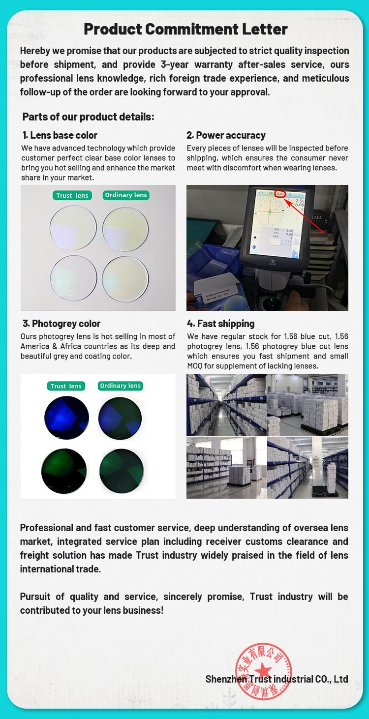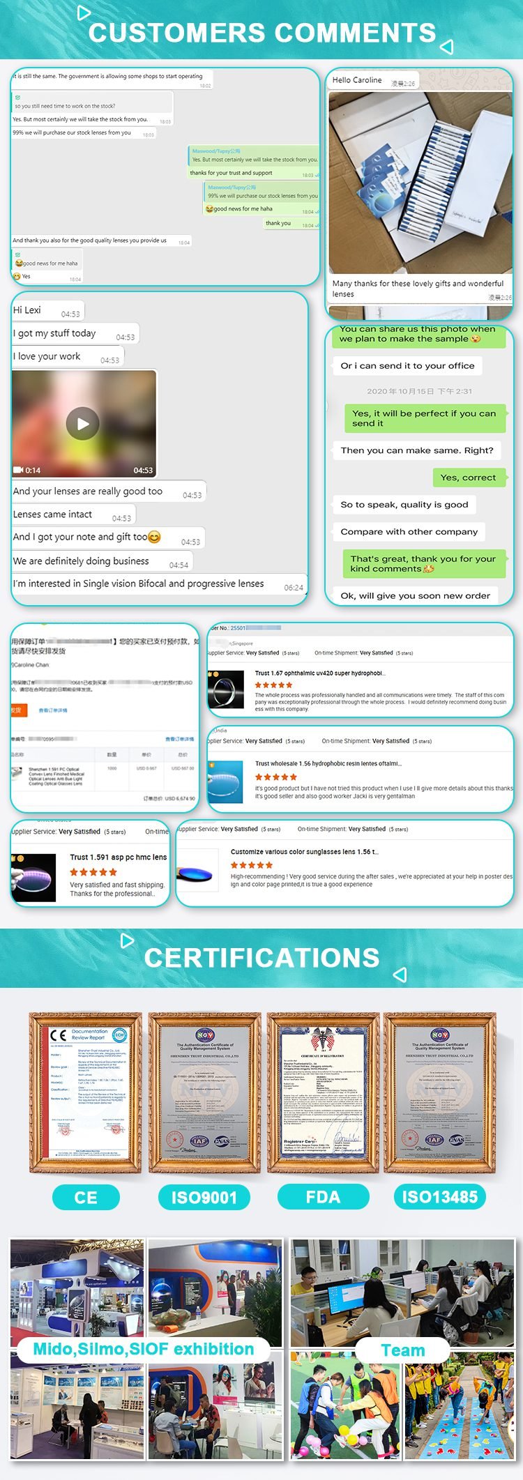 A wide range of products including index 1.499, 1.56, 1.60, 1.67, 1.71, 1.74, and bifocal, progressive, photochromic, coating photochroimic, blue cut, semi-finished lens and etc, which provides customer all in one store service.